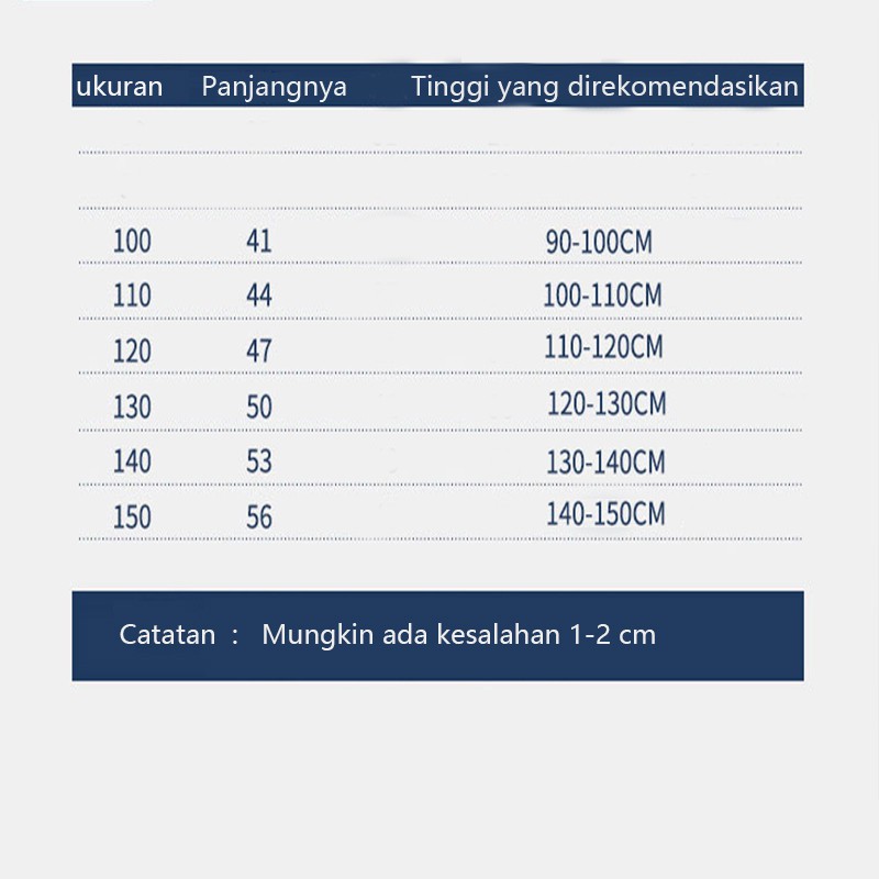 Produk ini memiliki 6 Variasi Size yaitu : Tinggi(90-100cm),Tinggi(100-110cm),Tinggi(110-120cm),Tinggi(120-130cm),Tinggi(130-140cm),Tinggi(140-150cm),